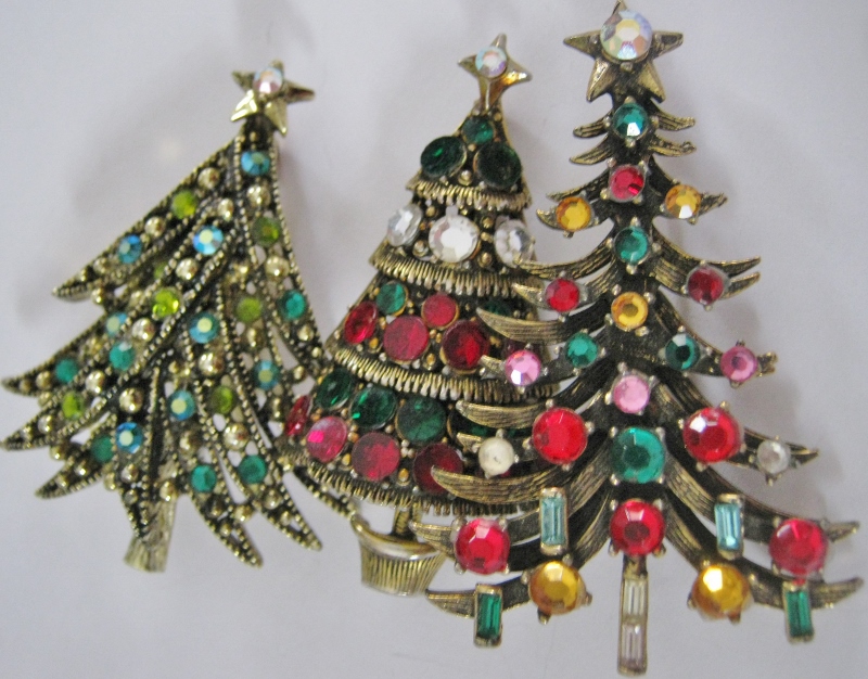 3 GORGEOUS HOLLYCRAFT CHRISTMAS TREE PINS (PHOTO)